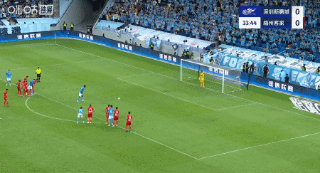 第34分钟,姆贝克利送点,韦斯利点球命中,新鹏城1-0梅州